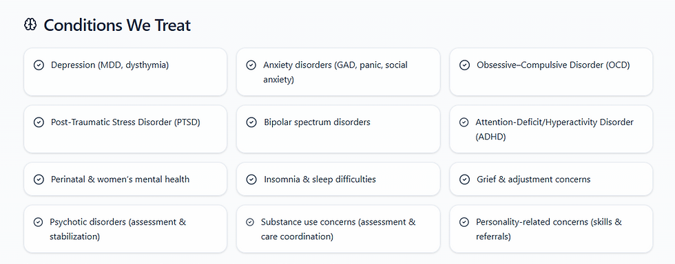 ​Our team includes a Board-Certified Psychiatrist and a Psychiatric-Mental Health Nurse Practitioner (PMHNP) providing compassionate, evidence-based care for your mind and well-being. We diagnose and treat mental health conditions for adolescents and adults, offering medication management and coordinated therapy resources.